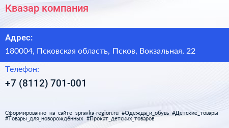 Квазар, компания по адресу 180004, Псковская область, Псков, Вокзальная, 22 в дальнейшем Организация, размещена в следующих категориях: