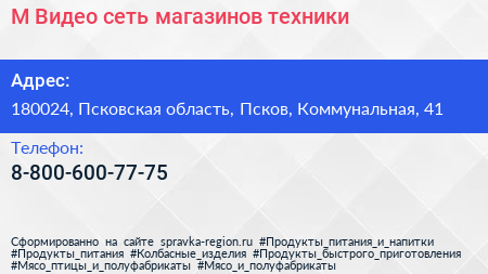М.Видео, сеть магазинов техники по адресу 180024, Псковская область, Псков, Коммунальная, 41 в дальнейшем Организация, размещена в следующих категориях: