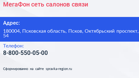 МегаФон, сеть салонов связи по адресу 180004, Псковская область, Псков, Октябрьский проспект, 54 в дальнейшем Организация, размещена в следующих категориях: