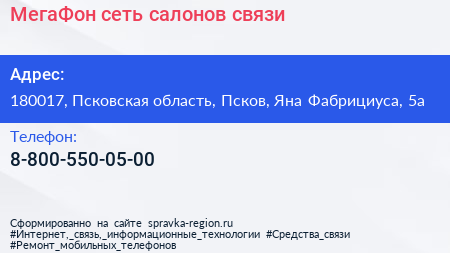 МегаФон, сеть салонов связи по адресу 180017, Псковская область, Псков, Яна Фабрициуса, 5а в дальнейшем Организация, размещена в следующих категориях: