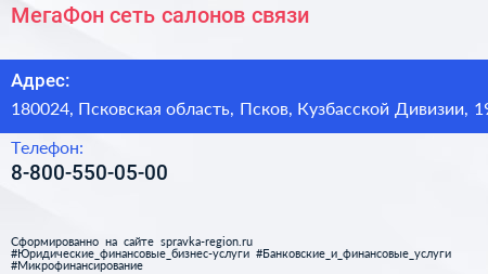 МегаФон, сеть салонов связи по адресу 180024, Псковская область, Псков, Кузбасской Дивизии, 19 в дальнейшем Организация, размещена в следующих категориях: