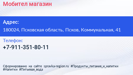 Мобител, магазин по адресу 180024, Псковская область, Псков, Коммунальная, 41 в дальнейшем Организация, размещена в следующих категориях: