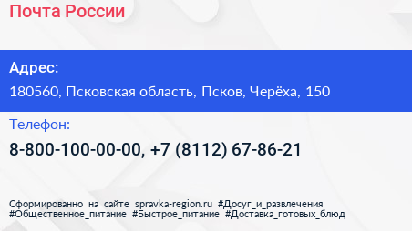 Почта России по адресу 180560, Псковская область, Псков, Черёха, 150 в дальнейшем Организация, размещена в следующих категориях: