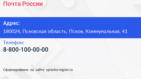 Почта России по адресу 180024, Псковская область, Псков, Коммунальная, 41 в дальнейшем Организация, размещена в следующих категориях: