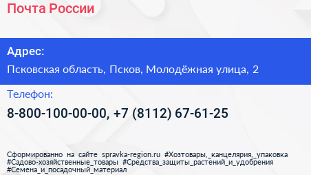 Почта России по адресу Псковская область, Псков, Молодёжная улица, 2 в дальнейшем Организация, размещена в следующих категориях: