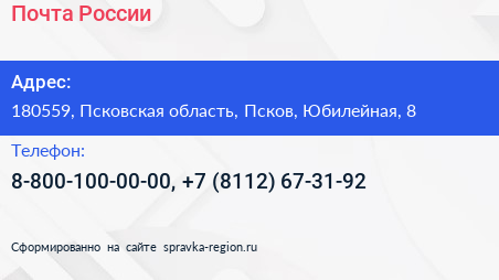 Почта России по адресу 180559, Псковская область, Псков, Юбилейная, 8 в дальнейшем Организация, размещена в следующих категориях: