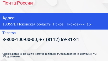 Почта России по адресу 180551, Псковская область, Псков, Писковичи, 15 в дальнейшем Организация, размещена в следующих категориях: