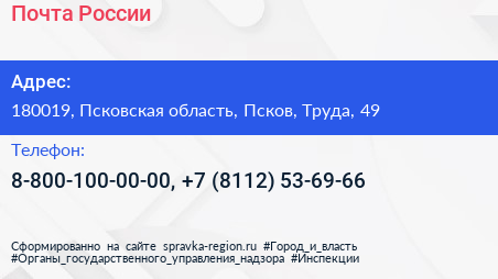 Почта России по адресу 180019, Псковская область, Псков, Труда, 49 в дальнейшем Организация, размещена в следующих категориях: