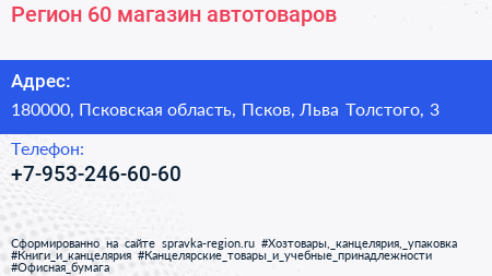 Регион 60, магазин автотоваров по адресу 180000, Псковская область, Псков, Льва Толстого, 3 в дальнейшем Организация, размещена в следующих категориях: