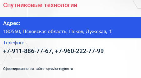 Спутниковые технологии по адресу 180560, Псковская область, Псков, Лужская, 1 в дальнейшем Организация, размещена в следующих категориях: