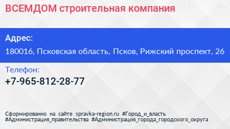 ВСЕМДОМ, строительная компания по адресу 180016, Псковская область, Псков, Рижский проспект, 26 в дальнейшем Организация, размещена в следующих категориях: