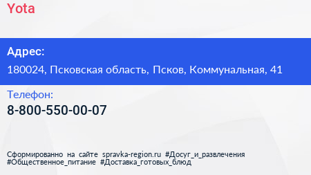 Yota по адресу 180024, Псковская область, Псков, Коммунальная, 41 в дальнейшем Организация, размещена в следующих категориях: