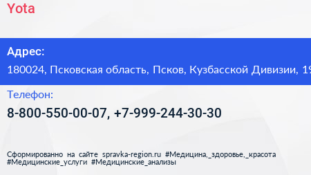 Yota по адресу 180024, Псковская область, Псков, Кузбасской Дивизии, 19 в дальнейшем Организация, размещена в следующих категориях: