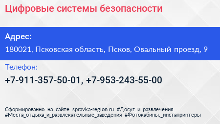 Цифровые системы безопасности по адресу 180021, Псковская область, Псков, Овальный проезд, 9 в дальнейшем Организация, размещена в следующих категориях: