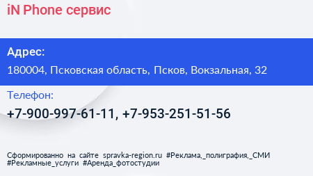 iN-Phone сервис по адресу 180004, Псковская область, Псков, Вокзальная, 32 в дальнейшем Организация, размещена в следующих категориях: