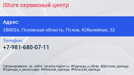 iStore, сервисный центр по адресу 180016, Псковская область, Псков, Юбилейная, 32 в дальнейшем Организация, размещена в следующих категориях: