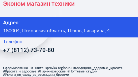 Эконом, магазин техники по адресу 180004, Псковская область, Псков, Гагарина, 4 в дальнейшем Организация, размещена в следующих категориях: