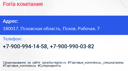 Foria, компания по адресу 180017, Псковская область, Псков, Рабочая, 7 в дальнейшем Организация, размещена в следующих категориях: