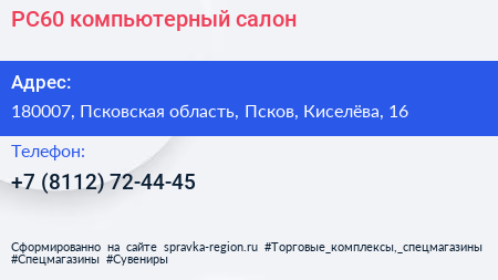 РС60, компьютерный салон по адресу 180007, Псковская область, Псков, Киселёва, 16 в дальнейшем Организация, размещена в следующих категориях: