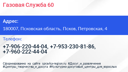 Газовая Служба 60 по адресу 180007, Псковская область, Псков, Петровская, 4 в дальнейшем Организация, размещена в следующих категориях: