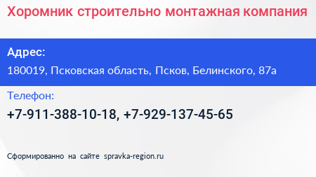 Хоромник, строительно-монтажная компания по адресу 180019, Псковская область, Псков, Белинского, 87а в дальнейшем Организация, размещена в следующих категориях: