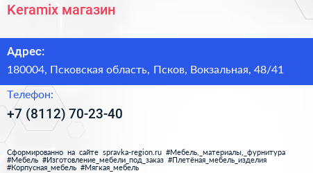 Keramix, магазин по адресу 180004, Псковская область, Псков, Вокзальная, 48/41 в дальнейшем Организация, размещена в следующих категориях: