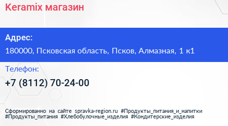 Keramix, магазин по адресу 180000, Псковская область, Псков, Алмазная, 1 к1 в дальнейшем Организация, размещена в следующих категориях: