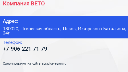 Компания ВЕТО по адресу 180020, Псковская область, Псков, Ижорского Батальона, 24г в дальнейшем Организация, размещена в следующих категориях: