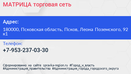 МАТРИЦА, торговая сеть по адресу 180000, Псковская область, Псков, Леона Поземского, 92 к1 в дальнейшем Организация, размещена в следующих категориях: