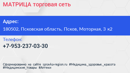 МАТРИЦА, торговая сеть по адресу 180502, Псковская область, Псков, Моторная, 3 к2 в дальнейшем Организация, размещена в следующих категориях: