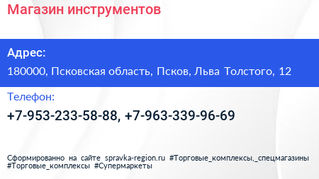 Магазин инструментов по адресу 180000, Псковская область, Псков, Льва Толстого, 12 в дальнейшем Организация, размещена в следующих категориях: