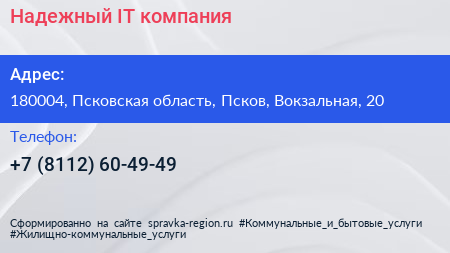 Надежный IT, компания по адресу 180004, Псковская область, Псков, Вокзальная, 20 в дальнейшем Организация, размещена в следующих категориях: