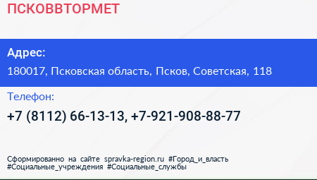 ПСКОВВТОРМЕТ по адресу 180017, Псковская область, Псков, Советская, 118 в дальнейшем Организация, размещена в следующих категориях: