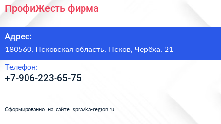 ПрофиЖесть, фирма по адресу 180560, Псковская область, Псков, Черёха, 21 в дальнейшем Организация, размещена в следующих категориях: