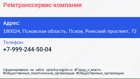 Ремтранссервис, компания по адресу 180024, Псковская область, Псков, Рижский проспект, 72 в дальнейшем Организация, размещена в следующих категориях: