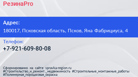 РезинаPro по адресу 180017, Псковская область, Псков, Яна Фабрициуса, 4 в дальнейшем Организация, размещена в следующих категориях: