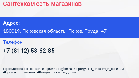 Сантехком, сеть магазинов по адресу 180019, Псковская область, Псков, Труда, 47 в дальнейшем Организация, размещена в следующих категориях: