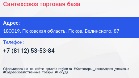 Сантехсоюз, торговая база по адресу 180019, Псковская область, Псков, Белинского, 87 в дальнейшем Организация, размещена в следующих категориях: