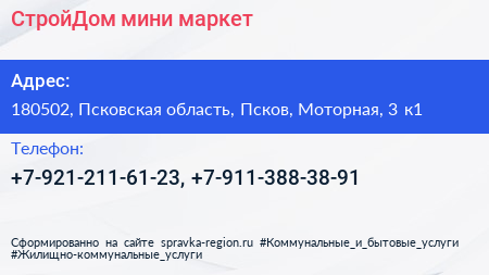 СтройДом, мини-маркет по адресу 180502, Псковская область, Псков, Моторная, 3 к1 в дальнейшем Организация, размещена в следующих категориях: