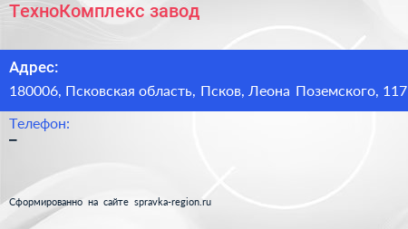 ТехноКомплекс, завод по адресу 180006, Псковская область, Псков, Леона Поземского, 117 в дальнейшем Организация, размещена в следующих категориях: