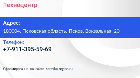 Техноцентр по адресу 180004, Псковская область, Псков, Вокзальная, 20 в дальнейшем Организация, размещена в следующих категориях:
