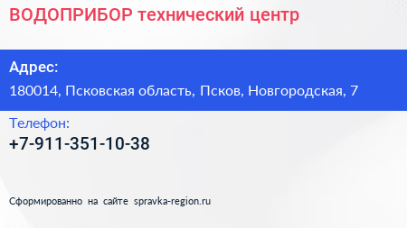 ВОДОПРИБОР, технический центр по адресу 180014, Псковская область, Псков, Новгородская, 7 в дальнейшем Организация, размещена в следующих категориях: