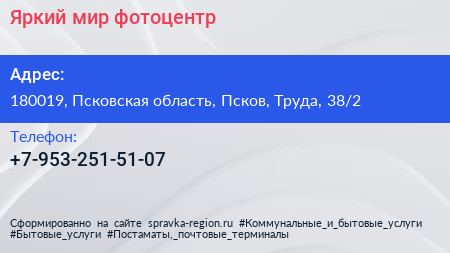 Яркий мир, фотоцентр по адресу 180019, Псковская область, Псков, Труда, 38/2 в дальнейшем Организация, размещена в следующих категориях: