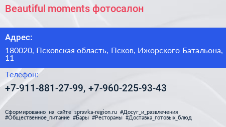 Beautiful moments, фотосалон по адресу 180020, Псковская область, Псков, Ижорского Батальона, 11 в дальнейшем Организация, размещена в следующих категориях: