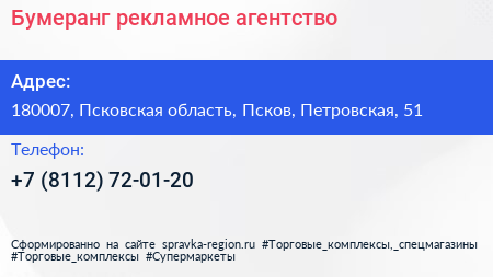 Бумеранг, рекламное агентство по адресу 180007, Псковская область, Псков, Петровская, 51 в дальнейшем Организация, размещена в следующих категориях: