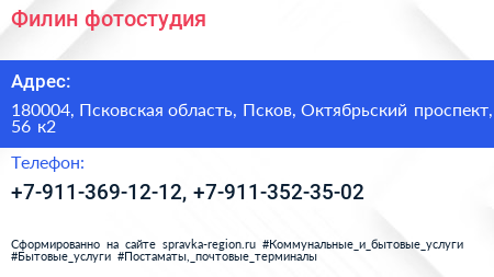 Филин, фотостудия по адресу 180004, Псковская область, Псков, Октябрьский проспект, 56 к2 в дальнейшем Организация, размещена в следующих категориях:
