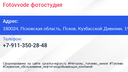 Fotovvode, фотостудия по адресу 180024, Псковская область, Псков, Кузбасской Дивизии, 19 в дальнейшем Организация, размещена в следующих категориях:
