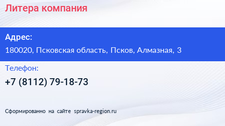Литера, компания по адресу 180020, Псковская область, Псков, Алмазная, 3 в дальнейшем Организация, размещена в следующих категориях: