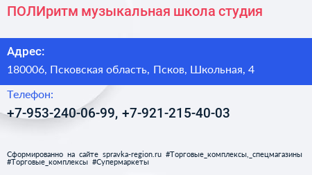 ПОЛИритм, музыкальная школа-студия по адресу 180006, Псковская область, Псков, Школьная, 4 в дальнейшем Организация, размещена в следующих категориях: