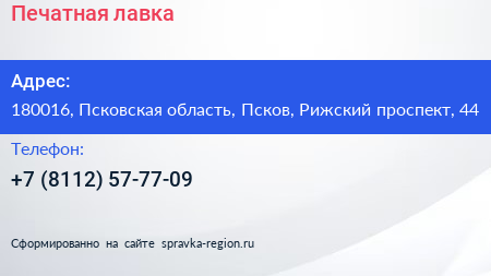 Печатная лавка по адресу 180016, Псковская область, Псков, Рижский проспект, 44 в дальнейшем Организация, размещена в следующих категориях:
